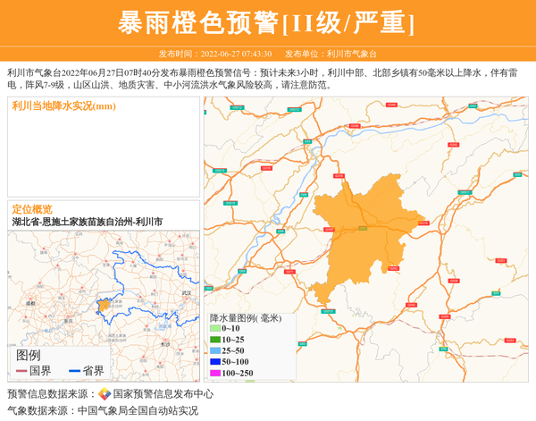 利川市气象台2022年06月27日07时40分发布暴雨橙色预警信号:预计未来3小时,利川中部、北部乡镇有50毫米以上降水,伴有雷电,阵风7-9级,山区山洪、地质灾害、中小河流洪水气象风险较高,请注意防范。 信息来源:国家预警信息发布中心; 发布单位:利川市气象台。