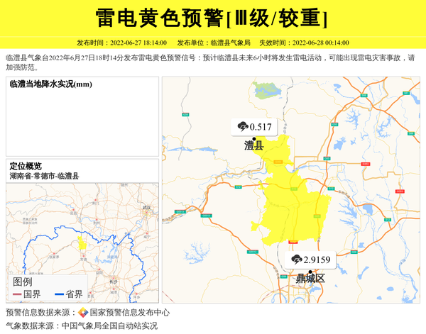 临澧县气象台2022年6月27日18时14分发布雷电黄色预警信号:预计临澧县未来6小时将发生雷电活动,可能出现雷电灾害事故,请加强防范。 信息来源:国家预警信息发布中心; 发布单位:临澧县气象局。