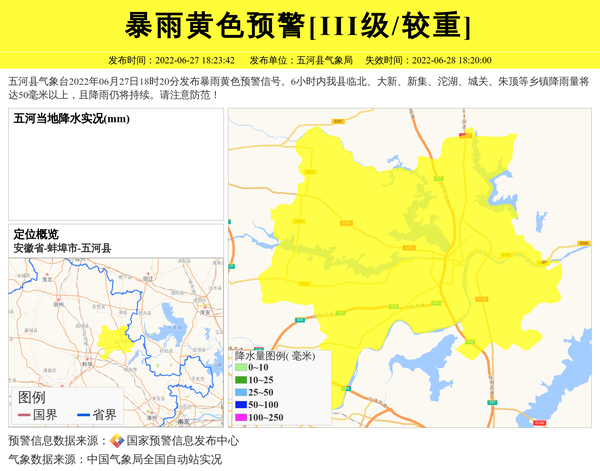 五河县气象台2022年06月27日18时20分发布暴雨黄色预警信号。6小时内我县临北、大新、新集、沱湖、城关、朱顶等乡镇降雨量将达50毫米以上,且降雨仍将持续。请注意防范! 信息来源:国家预警信息发布中心; 发布单位:五河县气象局。