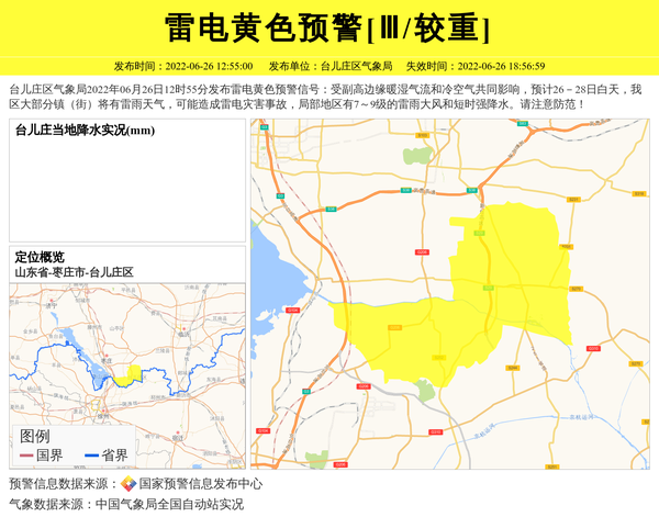 台儿庄区气象局2022年06月26日12时55分发布雷电黄色预警信号:受副高边缘暖湿气流和冷空气共同影响,预计26-28日白天,我区大部分镇(街)将有雷雨天气,可能造成雷电灾害事故,局部地区有7~9级的雷雨大风和短时强降水。请注意防范! 信息来源:国家预警信息发布中心; 发布单位:台儿庄区气象局。