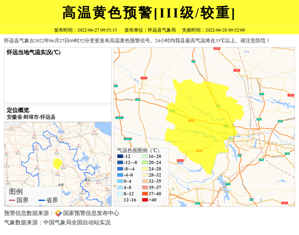 怀远县气象台2022年06月27日09时52分变更发布高温黄色预警信号。24小时内我县最高气温将在35℃以上。请注意防范! 信息来源:国家预警信息发布中心; 发布单位:怀远县气象局。