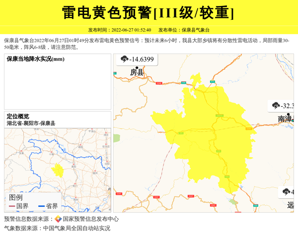 保康县气象台2022年06月27日01时49分发布雷电黄色预警信号:预计未来6小时,我县大部乡镇将有分散性雷电活动,局部雨量30-50毫米,阵风6-8级,请注意防范。 信息来源:国家预警信息发布中心; 发布单位:保康县气象台。