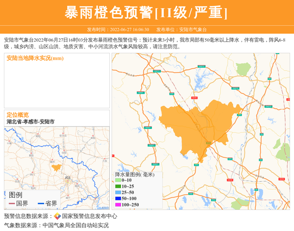 安陆市气象台2022年06月27日16时03分发布暴雨橙色预警信号:预计未来3小时,我市局部有50毫米以上降水,伴有雷电,阵风6-8级,城乡内涝、山区山洪、地质灾害、中小河流洪水气象风险较高,请注意防范。 信息来源:国家预警信息发布中心; 发布单位:安陆市气象台。