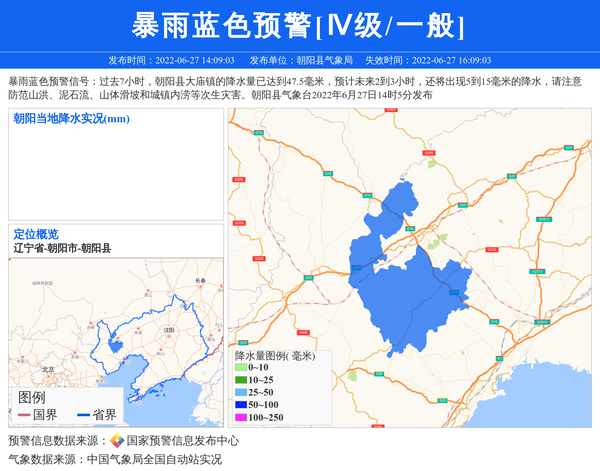 暴雨蓝色预警信号:过去7小时,朝阳县大庙镇的降水量已达到47.5毫米,预计未来2到3小时,还将出现5到15毫米的降水,请注意防范山洪、泥石流、山体滑坡和城镇内涝等次生灾害。朝阳县气象台2022年6月27日14时5分发布 信息来源:国家预警信息发布中心; 发布单位:朝阳县气象局。