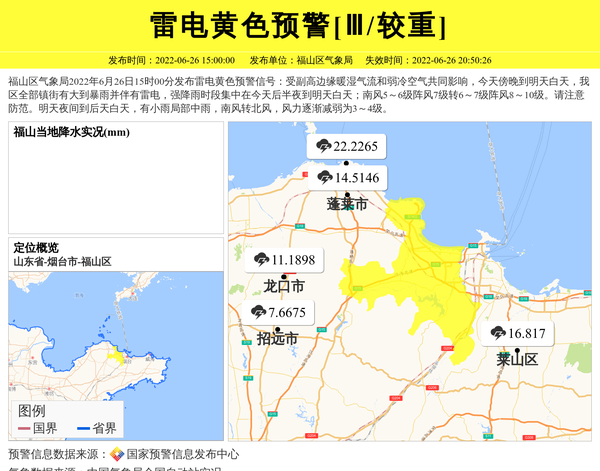 福山区气象局2022年6月26日15时00分发布雷电黄色预警信号:受副高边缘暖湿气流和弱冷空气共同影响,今天傍晚到明天白天,我区全部镇街有大到暴雨并伴有雷电,强降雨时段集中在今天后半夜到明天白天;南风5~6级阵风7级转6~7级阵风8~10级。请注意防范。明天夜间到后天白天,有小雨局部中雨,南风转北风,风力逐渐减弱为3~4级。 信息来源:国家预警信息发布中心; 发布单位:福山区气象局。