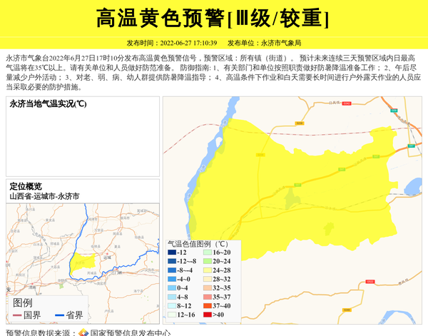 永济市气象台2022年6月27日17时10分发布高温黄色预警信号,预警区域:所有镇(街道)。 预计未来连续三天预警区域内日最高气温将在35℃以上。请有关单位和人员做好防范准备。 防御指南: 1、有关部门和单位按照职责做好防暑降温准备工作; 2、午后尽量减少户外活动; 3、对老、弱、病、幼人群提供防暑降温指导; 4、高温条件下作业和白天需要长时间进行户外露天作业的人员应当采取必要的防护措施。 信息来源:国家预警信息发布中心; 发布单位:永济市气象局。