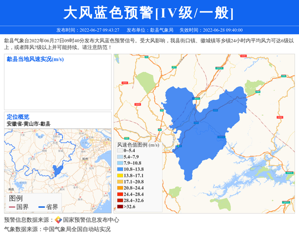 歙县气象台2022年06月27日09时40分发布大风蓝色预警信号。受大风影响,我县街口镇、徽城镇等乡镇24小时内平均风力可达6级以上,或者阵风7级以上并可能持续。请注意防范! 信息来源:国家预警信息发布中心; 发布单位:歙县气象局。