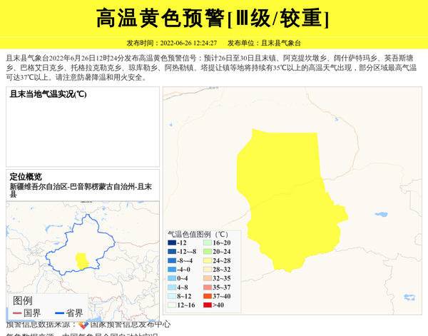 且末县气象台2022年6月26日12时24分发布高温黄色预警信号:预计26日至30日且末镇、阿克提坎墩乡、阔什萨特玛乡、英吾斯塘乡、巴格艾日克乡、托格拉克勒克乡、琼库勒乡、阿热勒镇、塔提让镇等地将持续有35℃以上的高温天气出现,部分区域最高气温可达37℃以上。请注意防暑降温和用火安全。 信息来源:国家预警信息发布中心; 发布单位:且末县气象台。