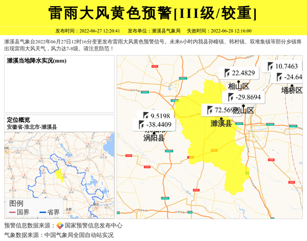 濉溪县气象台2022年06月27日12时16分变更发布雷雨大风黄色预警信号。未来6小时内我县孙疃镇、韩村镇、双堆集镇等部分乡镇将出现雷雨大风天气,风力达7-8级。请注意防范! 信息来源:国家预警信息发布中心; 发布单位:濉溪县气象局。