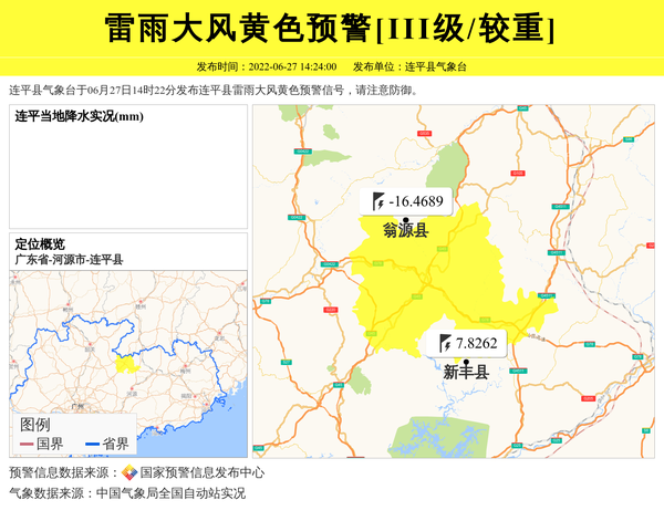 连平县气象台于06月27日14时22分发布连平县雷雨大风黄色预警信号,请注意防御。 信息来源:国家预警信息发布中心; 发布单位:连平县气象台。