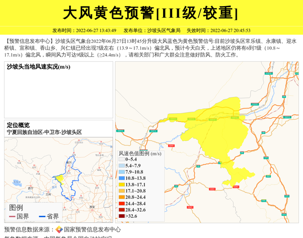 【预警信息发布中心】沙坡头区气象台2022年06月27日13时45分升级大风蓝色为黄色预警信号:目前沙坡头区常乐镇、永康镇、迎水桥镇、宣和镇、香山乡、兴仁镇已经出现7级左右(13.9~17.1m/s)偏北风,预计今天白天,上述地区仍将有6到7级(10.8~17.1m/s)偏北风,瞬间风力可达9级以上(≥24.4m/s),请相关部门和广大群众注意做好防风、防火工作。 信息来源:国家预警信息发布中心; 发布单位:沙坡头区气象局。