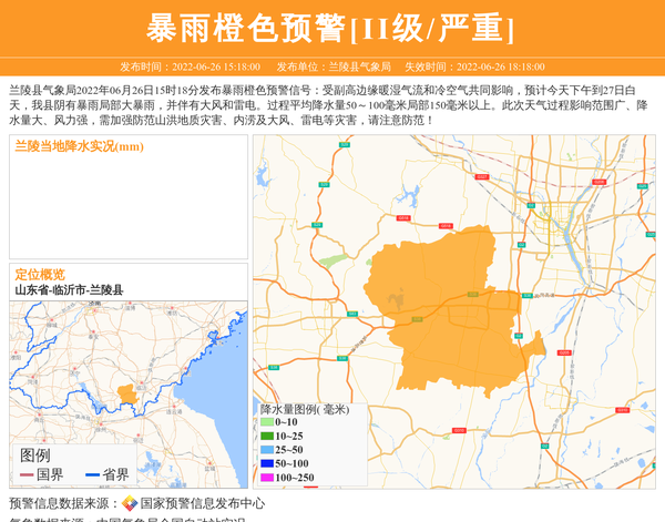 兰陵县气象局2022年06月26日15时18分发布暴雨橙色预警信号:受副高边缘暖湿气流和冷空气共同影响,预计今天下午到27日白天,我县阴有暴雨局部大暴雨,并伴有大风和雷电。过程平均降水量50~100毫米局部150毫米以上。此次天气过程影响范围广、降水量大、风力强,需加强防范山洪地质灾害、内涝及大风、雷电等灾害,请注意防范! 信息来源:国家预警信息发布中心; 发布单位:兰陵县气象局。