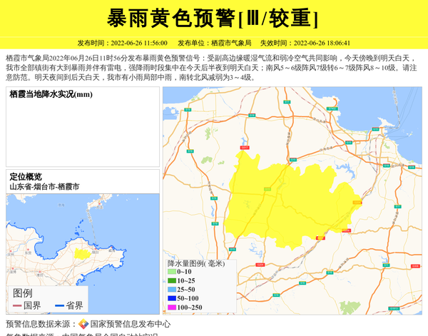 栖霞市气象局2022年06月26日11时56分发布暴雨黄色预警信号:受副高边缘暖湿气流和弱冷空气共同影响,今天傍晚到明天白天,我市全部镇街有大到暴雨并伴有雷电,强降雨时段集中在今天后半夜到明天白天;南风5~6级阵风7级转6~7级阵风8~10级。请注意防范。明天夜间到后天白天,我市有小雨局部中雨,南转北风减弱为3~4级。 信息来源:国家预警信息发布中心; 发布单位:栖霞市气象局。