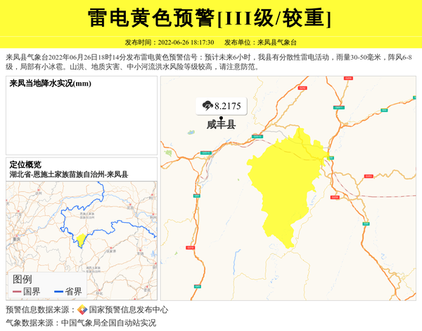 来凤县气象台2022年06月26日18时14分发布雷电黄色预警信号:预计未来6小时,我县有分散性雷电活动,雨量30-50毫米,阵风6-8级,局部有小冰雹。山洪、地质灾害、中小河流洪水风险等级较高,请注意防范。 信息来源:国家预警信息发布中心; 发布单位:来凤县气象台。