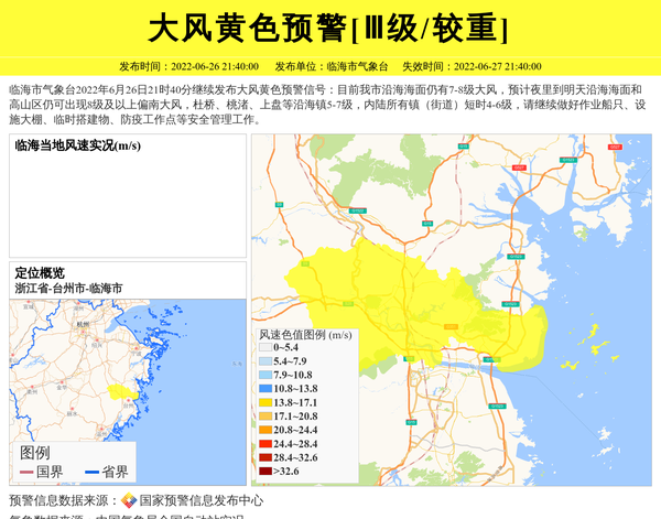 临海市气象台2022年6月26日21时40分继续发布大风黄色预警信号:目前我市沿海海面仍有7-8级大风,预计夜里到明天沿海海面和高山区仍可出现8级及以上偏南大风,杜桥、桃渚、上盘等沿海镇5-7级,内陆所有镇(街道)短时4-6级,请继续做好作业船只、设施大棚、临时搭建物、防疫工作点等安全管理工作。 信息来源:国家预警信息发布中心; 发布单位:临海市气象台。
