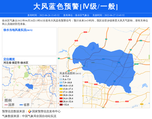 徐水区气象台2022年06月26日13时42分发布大风蓝色预警信号:预计未来24小时内,我区全部乡镇将受大风天气影响,请有关单位和人员做好防范准备。 信息来源:国家预警信息发布中心; 发布单位:徐水区气象台。