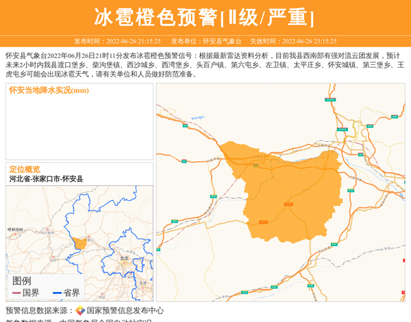 怀安县气象台2022年06月26日21时11分发布冰雹橙色预警信号:根据最新雷达资料分析,目前我县西南部有强对流云团发展,预计未来2小时内我县渡口堡乡、柴沟堡镇、西沙城乡、西湾堡乡、头百户镇、第六屯乡、左卫镇、太平庄乡、怀安城镇、第三堡乡、王虎屯乡可能会出现冰雹天气,请有关单位和人员做好防范准备。 信息来源:国家预警信息发布中心; 发布单位:怀安县气象台。