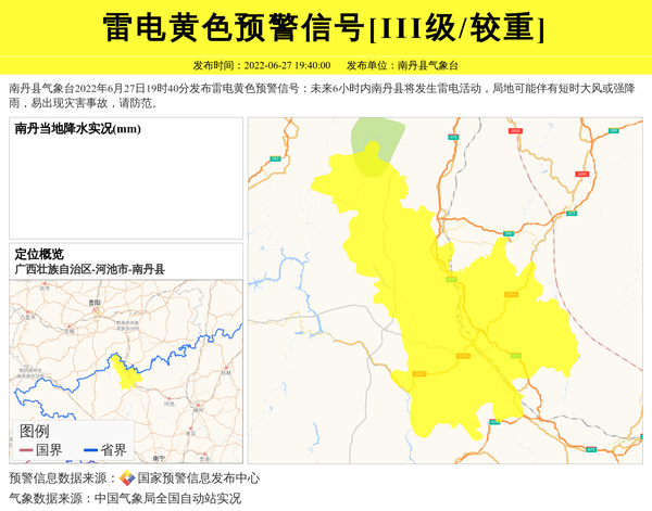 南丹县气象台2022年6月27日19时40分发布雷电黄色预警信号:未来6小时内南丹县将发生雷电活动,局地可能伴有短时大风或强降雨,易出现灾害事故,请防范。 信息来源:国家预警信息发布中心; 发布单位:南丹县气象台。