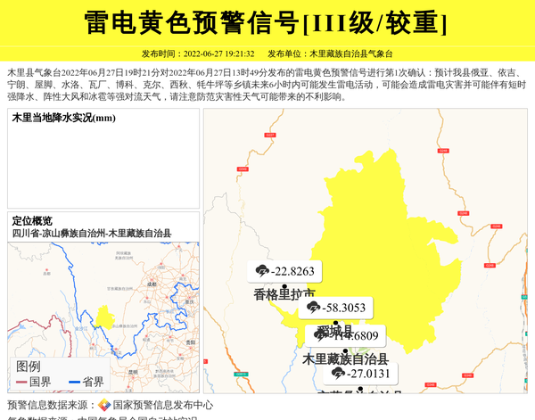 木里县气象台2022年06月27日19时21分对2022年06月27日13时49分发布的雷电黄色预警信号进行第1次确认:预计我县俄亚、依吉、宁朗、屋脚、水洛、瓦厂、博科、克尔、西秋、牦牛坪等乡镇未来6小时内可能发生雷电活动,可能会造成雷电灾害并可能伴有短时强降水、阵性大风和冰雹等强对流天气,请注意防范灾害性天气可能带来的不利影响。 信息来源:国家预警信息发布中心; 发布单位:木里藏族自治县气象台。