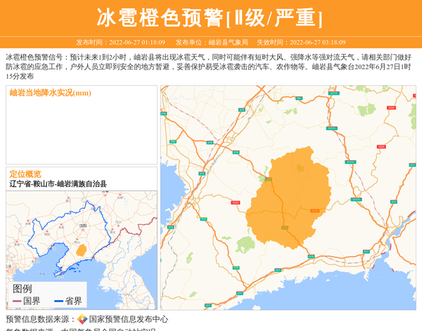 冰雹橙色预警信号:预计未来1到2小时,岫岩县将出现冰雹天气,同时可能伴有短时大风、强降水等强对流天气,请相关部门做好防冰雹的应急工作,户外人员立即到安全的地方暂避,妥善保护易受冰雹袭击的汽车、农作物等。岫岩县气象台2022年6月27日1时15分发布 信息来源:国家预警信息发布中心; 发布单位:岫岩县气象局。