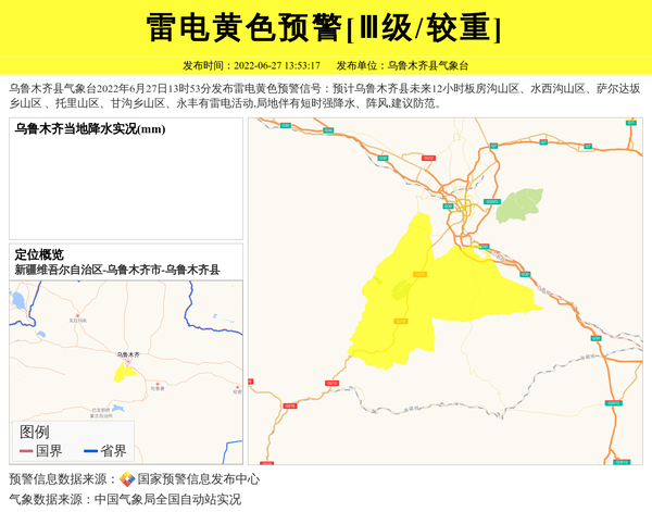 乌鲁木齐县气象台2022年6月27日13时53分发布雷电黄色预警信号:预计乌鲁木齐县未来12小时板房沟山区、水西沟山区、萨尔达坂乡山区 、托里山区、甘沟乡山区、永丰有雷电活动,局地伴有短时强降水、阵风,建议防范。 信息来源:国家预警信息发布中心; 发布单位:乌鲁木齐县气象台。
