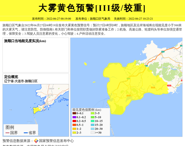 旅顺口区气象台2022年06月27日00时19分发布大雾黄色预警信号:预计27日0时到9时,旅顺地区及沿岸海域将出现能见度小于500米的大雾天气,请注意防范。防御指南1.有关部门和单位按照职责做好防雾准备工作;2.机场、高速公路、轮渡码头等单位加强交通管理,保障安全;3.驾驶人员注意雾的变化,小心驾驶;4.户外活动注意安全。 信息来源:国家预警信息发布中心; 发布单位:旅顺口区气象局。