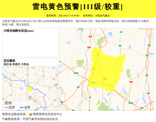 大悟县气象台2022年06月27日14时36分发布雷电黄色预警信号:预计未来6小时,我县局部有雷电活动,部分乡镇雨量30-50毫米,阵风7-9级,请注意防范。 信息来源:国家预警信息发布中心; 发布单位:大悟县气象台。