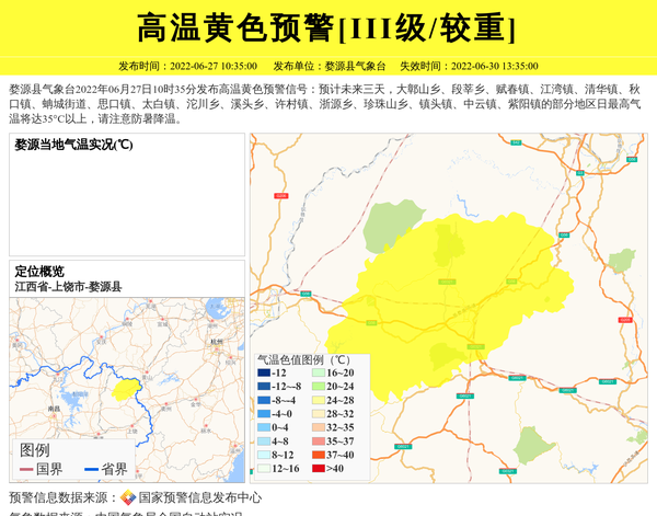 婺源县气象台2022年06月27日10时35分发布高温黄色预警信号:预计未来三天,大鄣山乡、段莘乡、赋春镇、江湾镇、清华镇、秋口镇、蚺城街道、思口镇、太白镇、沱川乡、溪头乡、许村镇、浙源乡、珍珠山乡、镇头镇、中云镇、紫阳镇的部分地区日最高气温将达35°C以上,请注意防暑降温。 信息来源:国家预警信息发布中心; 发布单位:婺源县气象台。