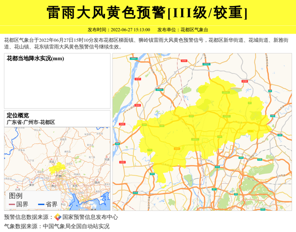 花都区气象台于2022年06月27日15时10分发布花都区梯面镇、狮岭镇雷雨大风黄色预警信号,花都区新华街道、花城街道、新雅街道、花山镇、花东镇雷雨大风黄色预警信号继续生效。 信息来源:国家预警信息发布中心; 发布单位:花都区气象台。
