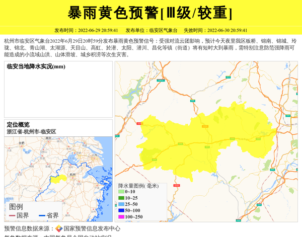 杭州市临安区气象台2022年6月29日20时59分发布暴雨黄色预警信号:受强对流云团影响,预计今天夜里我区板桥、锦南、锦城、玲珑、锦北、青山湖、太湖源、天目山、高虹、於潜、太阳、潜川、昌化等镇(街道)将有短时大到暴雨,需特别注意防范强降雨可能造成的小流域山洪、山体滑坡、城乡积涝等次生灾害。 信息来源:国家预警信息发布中心; 发布单位:临安区气象台。
