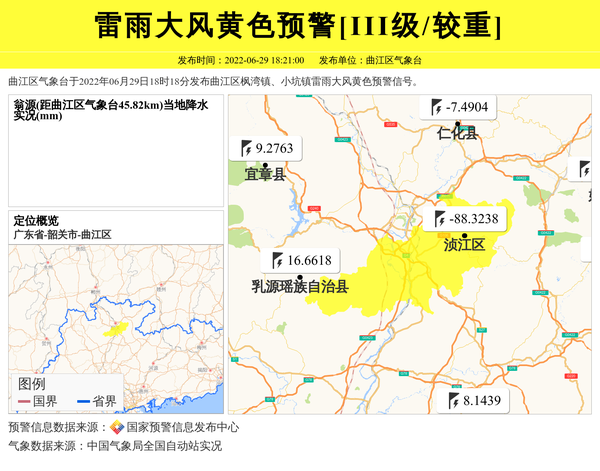 曲江区气象台于2022年06月29日18时18分发布曲江区枫湾镇、小坑镇雷雨大风黄色预警信号。 信息来源:国家预警信息发布中心; 发布单位:曲江区气象台。