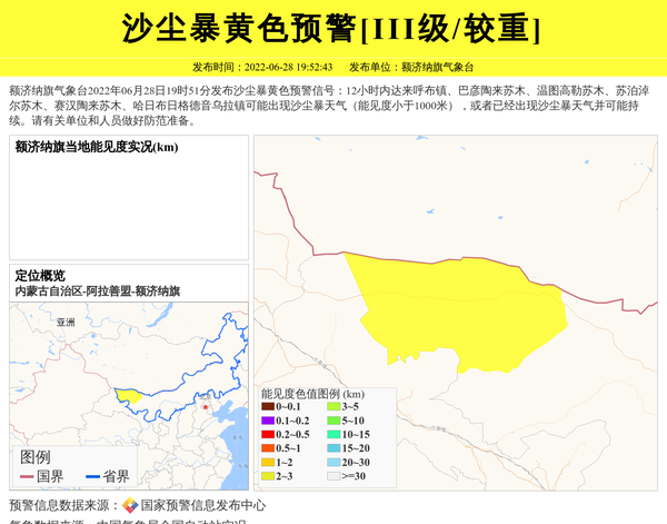 额济纳旗气象台2022年06月28日19时51分发布沙尘暴黄色预警信号:12小时内达来呼布镇、巴彦陶来苏木、温图高勒苏木、苏泊淖尔苏木、赛汉陶来苏木、哈日布日格德音乌拉镇可能出现沙尘暴天气(能见度小于1000米),或者已经出现沙尘暴天气并可能持续。请有关单位和人员做好防范准备。 信息来源:国家预警信息发布中心; 发布单位:额济纳旗气象台。