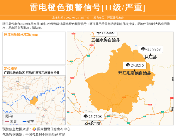 环江县气象台2022年6月28日11时37分继续发布雷电橙色预警信号:环江县已受雷电活动影响且将持续,局地伴有短时大风或强降水,易出现灾害事故,请防范。 信息来源:国家预警信息发布中心; 发布单位:环江县气象台。