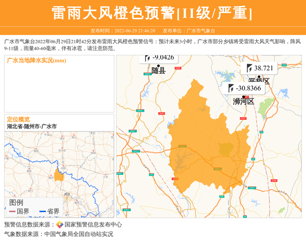 广水市气象台2022年06月29日21时42分发布雷雨大风橙色预警信号:预计未来3小时,广水市部分乡镇将受雷雨大风天气影响,阵风9-11级,雨量40-60毫米,伴有冰雹,请注意防范。 信息来源:国家预警信息发布中心; 发布单位:广水市气象台。
