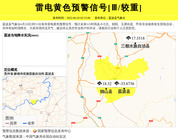 荔波县气象台6月28日2时33分发布雷电黄色预警信号:预计未来3小时我县小七孔、朝阳、玉屏街道、甲良等乡镇将发生雷电活动,并伴有短时强降水、大风等强对流天气,建议停止高空作业和户外作业,请相关行业和个人注意防范。 信息来源:国家预警信息发布中心; 发布单位:荔波县气象台。