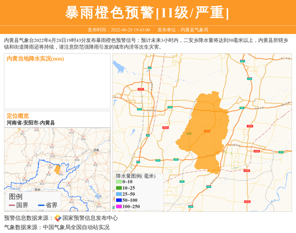 内黄县气象台2022年6月28日19时43分发布暴雨橙色预警信号:预计未来3小时内,二安乡降水量将达到50毫米以上,内黄县所辖乡镇和街道降雨还将持续,请注意防范强降雨引发的城市内涝等次生灾害。 信息来源:国家预警信息发布中心; 发布单位:内黄县气象局。