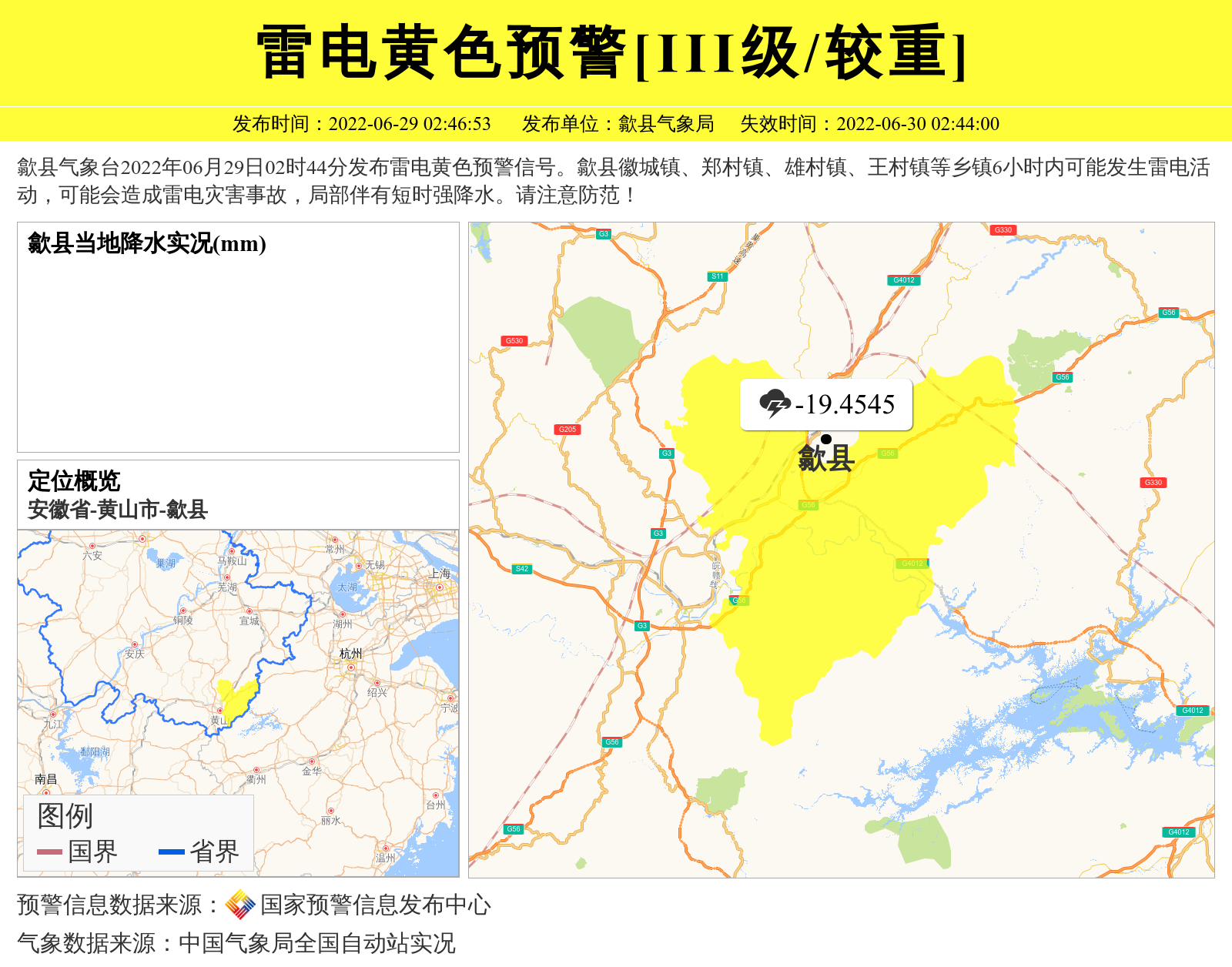 歙县气象台2022年06月29日02时44分发布雷电黄色预警信号。歙县徽城镇、郑村镇、雄村镇、王村镇等乡镇6小时内可能发生雷电活动,可能会造成雷电灾害事故,局部伴有短时强降水。请注意防范! 信息来源:国家预警信息发布中心; 发布单位:歙县气象局。