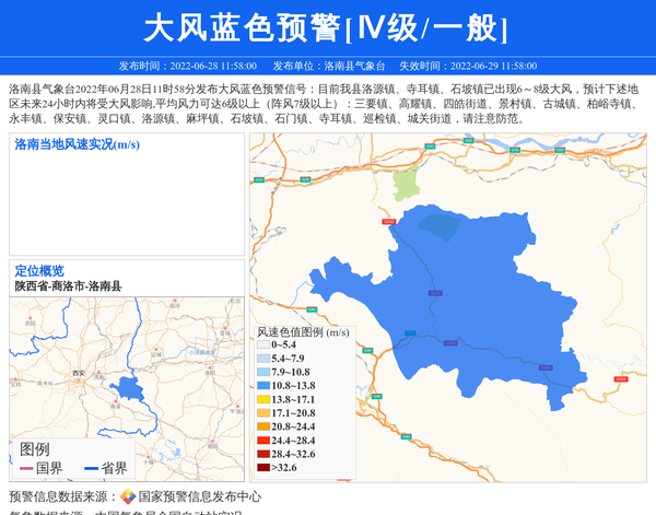 洛南县气象台2022年06月28日11时58分发布大风蓝色预警信号:目前我县洛源镇、寺耳镇、石坡镇已出现6~8级大风,预计下述地区未来24小时内将受大风影响,平均风力可达6级以上(阵风7级以上):三要镇、高耀镇、四皓街道、景村镇、古城镇、柏峪寺镇、永丰镇、保安镇、灵口镇、洛源镇、麻坪镇、石坡镇、石门镇、寺耳镇、巡检镇、城关街道,请注意防范。 信息来源:国家预警信息发布中心; 发布单位:洛南县气象台。