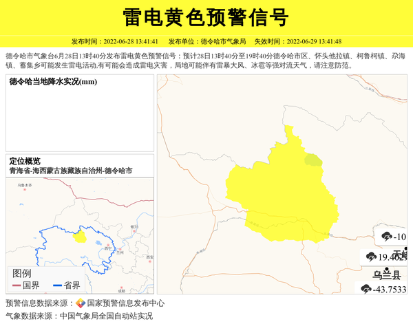 德令哈市气象台发布雷电黄色预警信号