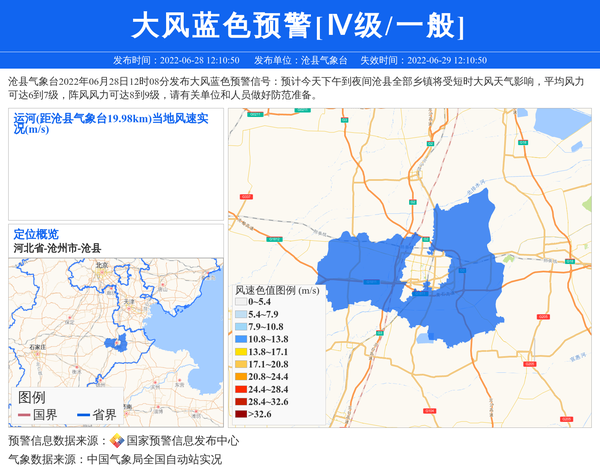 沧县气象台2022年06月28日12时08分发布大风蓝色预警信号:预计今天下午到夜间沧县全部乡镇将受短时大风天气影响,平均风力可达6到7级,阵风风力可达8到9级,请有关单位和人员做好防范准备。 信息来源:国家预警信息发布中心; 发布单位:沧县气象台。
