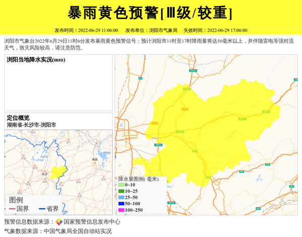 浏阳市气象台2022年6月29日11时6分发布暴雨黄色预警信号:预计浏阳市11时至17时降雨量将达50毫米以上,并伴随雷电等强对流天气,致灾风险较高,请注意防范。 信息来源:国家预警信息发布中心; 发布单位:浏阳市气象局。