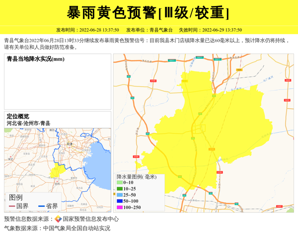青县气象台2022年06月28日13时33分继续发布暴雨黄色预警信号:目前我县木门店镇降水量已达60毫米以上,预计降水仍将持续,请有关单位和人员做好防范准备。 信息来源:国家预警信息发布中心; 发布单位:青县气象台。