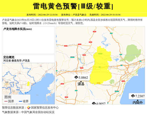 卢龙县气象台2022年06月29日12时13分发布雷电黄色预警信号:预计未来6小时内,我县全部乡镇将出现雷阵雨天气,降雨时将伴有雷电、短时大风(7-8级)、短时强降水(15-25mm/h)等强对流天气,请防范。 信息来源:国家预警信息发布中心; 发布单位:卢龙县气象台。