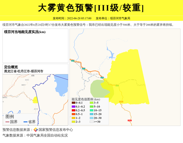 绥芬河市气象台2022年6月28日5时17分发布大雾黄色预警信号:我市已经出现能见度小于500米、大于等于200米的雾并将持续。 信息来源:国家预警信息发布中心; 发布单位:绥芬河市气象局。