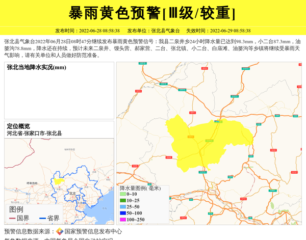张北县气象台2022年06月28日08时47分继续发布暴雨黄色预警信号:我县二泉井乡24小时降水量已达到98.3mm,小二台87.3mm,油篓沟78.8mm,降水还在持续,预计未来二泉井、馒头营、郝家营、二台、张北镇、小二台、白庙滩、油篓沟等乡镇将继续受暴雨天气影响,请有关单位和人员做好防范准备。 信息来源:国家预警信息发布中心; 发布单位:张北县气象台。