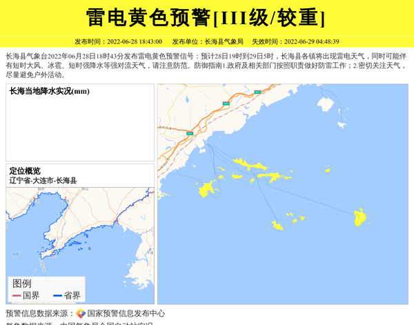 长海县气象台2022年06月28日18时43分发布雷电黄色预警信号:预计28日19时到29日5时,长海县各镇将出现雷电天气,同时可能伴有短时大风、冰雹、短时强降水等强对流天气,请注意防范。防御指南1.政府及相关部门按照职责做好防雷工作;2.密切关注天气,尽量避免户外活动。 信息来源:国家预警信息发布中心; 发布单位:长海县气象局。