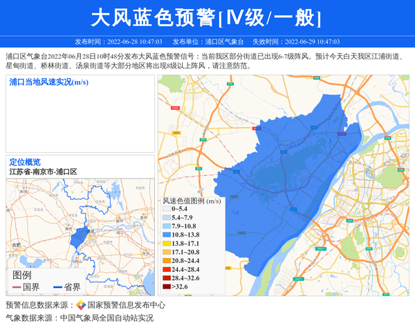 浦口区气象台2022年06月28日10时48分发布大风蓝色预警信号:当前我区部分街道已出现6-7级阵风。预计今天白天我区江浦街道、星甸街道、桥林街道、汤泉街道等大部分地区将出现8级以上阵风,请注意防范。 信息来源:国家预警信息发布中心; 发布单位:浦口区气象台。