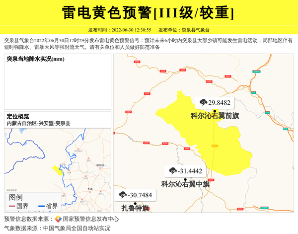 突泉县气象台2022年06月30日12时29分发布雷电黄色预警信号:预计未来6小时内突泉县大部乡镇可能发生雷电活动,局部地区伴有短时强降水、雷暴大风等强对流天气。请有关单位和人员做好防范准备 信息来源:国家预警信息发布中心; 发布单位:突泉县气象台。