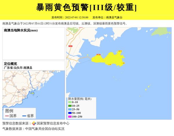 南澳县气象台于2022年07月01日12时51分发布南澳县后宅镇、云澳镇、深澳镇暴雨黄色预警信号。 信息来源:国家预警信息发布中心; 发布单位:南澳县气象台。