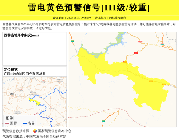 西林县气象台2022年6月30日9时28分发布雷电黄色预警信号:预计未来6小时内我县可能发生雷电活动,并可能伴有短时强降水,可能会造成雷电灾害事故,请做好防范。 信息来源:国家预警信息发布中心; 发布单位:西林县气象台。